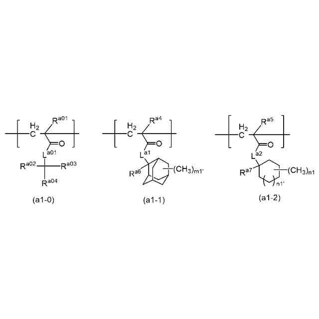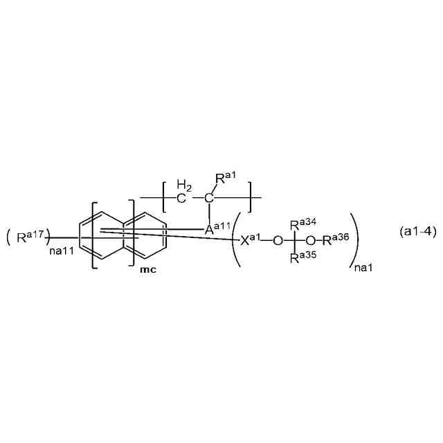 -で置き換わる場合、各基において同様の例を適用するものとし、置き換わる前の炭素数を炭化水素基等の炭素数とする。「組み合わせた基」とは、例示した基を2種以上結合させた基を意味し、それら基の価数は結合形態によって適宜変更してもよい。「由来する」又は「誘導される」とは、その分子中に含まれる重合性C=C結合が重合により-C-C-基(単結合)となることを指す。立体異性体が存在する場合は、全ての立体異性体を含む。各基は、置換基の数等によって、その基に含まれる任意の位置及び数の水素原子が結合部位に置き換わることがある。置換基における炭素数は、被置換基の炭素数には含めない。「酸不安定基」とは、酸(例えば、トリフルオロメタンスルホン酸等)と接触すると、脱離基が脱離して、親水性基(例えば、ヒドロキシ基又はカルボキシ基等)を形成する基を意味する。「塩基不安定基」とは、塩基(例えば、トリメチルアミン、テトラメチルアンモニウムヒドロキシド等)と接触すると、脱離基が脱離して、親水性基(例えば、カルボキシ基又はヒドロキシ基等)を形成する基を意味する。