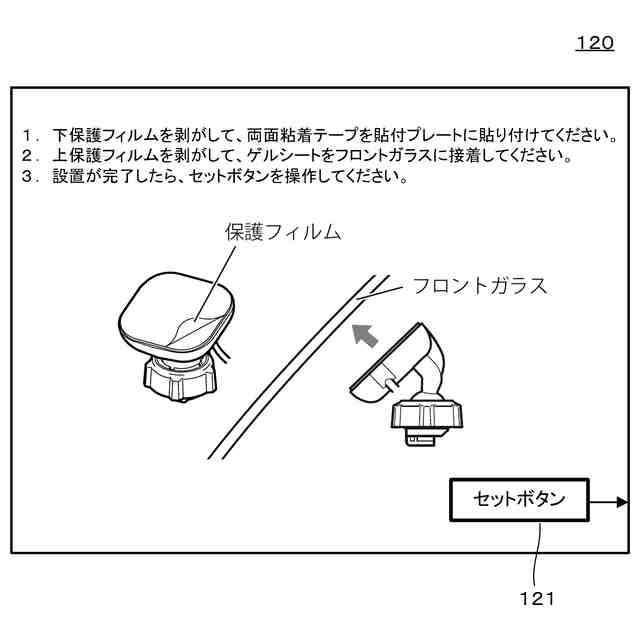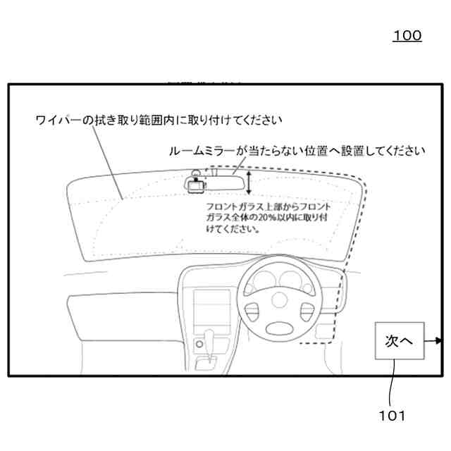 また、ドライブレコーダは、事故時の画像記録に利用される場合があることから、強固に設置する必要があり、強力な両面粘着テープでフロントガラスへ貼り付ける方法で設置される場合が多い。そのため、いちど貼り付けてしまうと、いずれかの制約を満たさない位置であることが後からわかったとしても、剥がすのが困難である。また、剥がせたとしても、粘着力が低下して再貼り付けが困難になる。