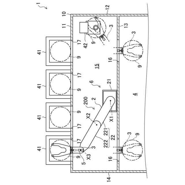 図1は、基板搬送システム1の平面図である。図2は、基板搬送システム1のブロック図である。基板搬送システム1は、基板9を搬送する。基板9は、半導体ウェハ又はガラス基板である。基板搬送システム1は、例えばEFEM(Equipment Front End Module)である。基板搬送システム1は、例えばソータ(Sorter)である。基板搬送システム1は、例えばストッカ(Stocker)である。ロボットシステム6は、基板搬送システム1に組み込まれる。