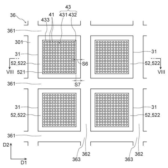 前記複数の第1領域はそれぞれ、前記第3面から前記第4面へ貫通する複数の第2開口を含む有効領域を含み、