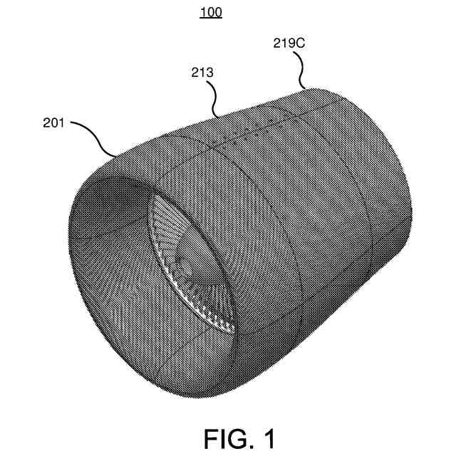 図1は、一実施形態による推進機ファン100の斜視図を示す。一般に、推進機ファン100は、推力生成中に推進機ファン100から出されるノイズをトータルで低減する複数の構成要素を含む。従って、推進機ファン100は、騒音公害を低減する。例えば、推進機ファン100は、複数のファン翼板を含んだ、張力が作用するファン翼を含む。ファン翼に張力をかけることによって、推進機ファンが最大推力を生成しているか、または動作していない(例えば、静止している)かにかかわらず、ファン翼板の角度は実質的に同じ角度に維持される。その結果、従来の推進機ファンと比較して、騒音汚染が低減され、推力効率が向上する。推進機ファン100は、ファン翼板の角度が所定の許容範囲内に維持されることを前提として騒音汚染を低減する。例えば、推進機ファン100は、300フィートのサイドライン/5,000lbfで65dBA未満のノイズを放出する。