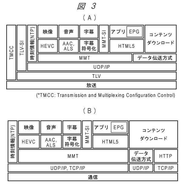 MMTを用いる放送システムのプロトコルスタックの概念図である。