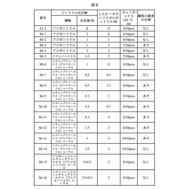 前記ジニトリル化合物は、スクシノニトリル、グルタロニトリル、アジポニトリル、1,5-ジシアノペンタン、1,6-ジシアノヘキサン、1,7-ジシアノヘプタン、1,8-ジシアノオクタン、1,9-ジシアノノナン、1,10-ジシアノデカン、1,12-ジシアノドデカン、テトラメチルスクシノニトリル、2-メチルグルタロニトリル、2,4-ジメチルグルタロニトリル、2,2,4,4-テトラメチルグルタロニトリル、およびエチレングリコールビス(プロピオニトリル)エーテルのうちの少なくとも1種を含み、