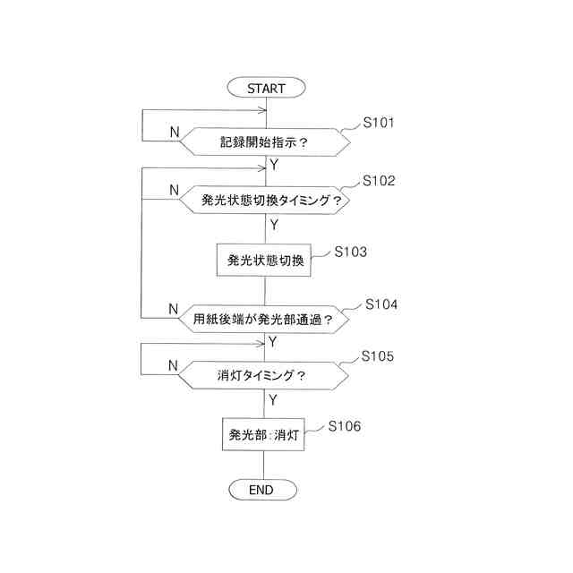 前記発光部を制御する制御部は、前記媒体受けトレイが少なくとも前記第1状態にあるかを検出可能であるとともに、前記媒体受けトレイが前記第1状態にあって前記発光部が消灯している際に記録開始の指示を受けると、前記発光部を発光させず、かつ記録動作の開始を保留する、