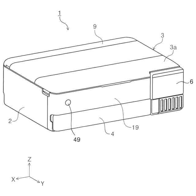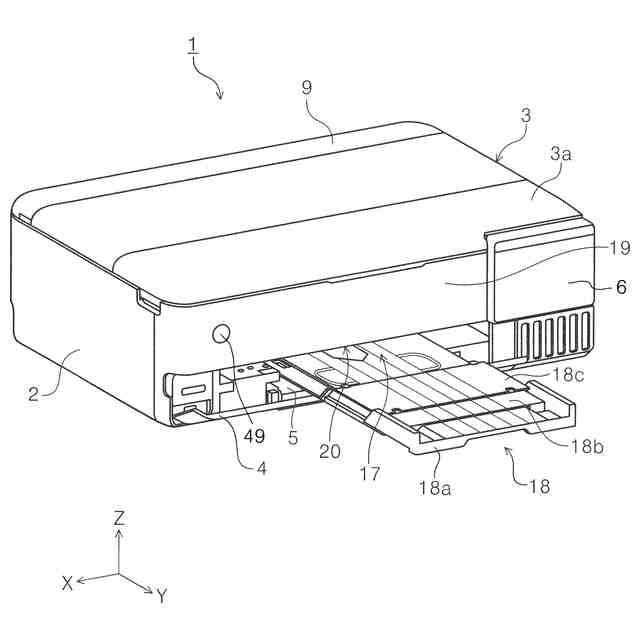 用紙受けトレイを第1状態としたプリンターの斜視図。