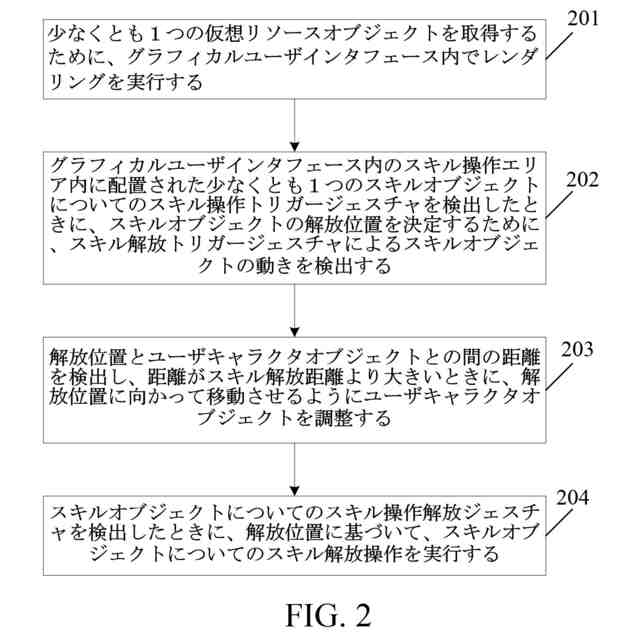 【解決手段】方法は仮想リソースオブジェクトを取得するために、グラフィカルユーザインタフェース内でレンダリングを実行し;スキル操作エリア内に配置された少なくとも1つのスキルオブジェクトについてのスキル操作トリガージェスチャを検出したときに、スキルオブジェクトの解放位置を決定するために、スキル解放トリガージェスチャによるスキルオブジェクトの動きを検出し;解放位置とユーザキャラクタオブジェクトとの間の距離を検出し、距離がスキル解放距離より大きいときに、解放位置に向かって移動させるようにユーザキャラクタオブジェクトを調整し;及び、スキルオブジェクトについてのスキル操作解放ジェスチャを検出したときに、解放位置に基づいて、スキルオブジェクトについてのスキル解放操作を実行することを含む。