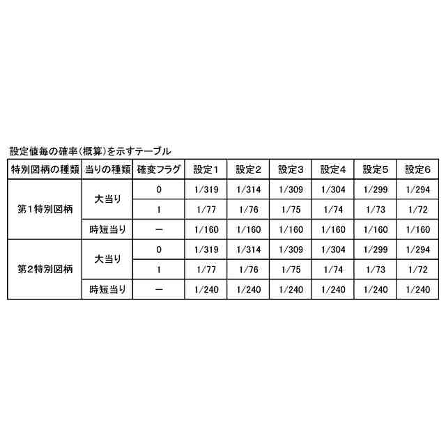 第1のパチンコ遊技機における設定値毎の大当り確率(概算)を示すテーブルの一例である。