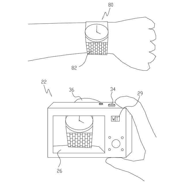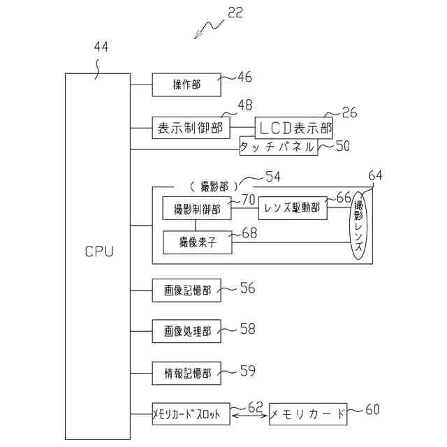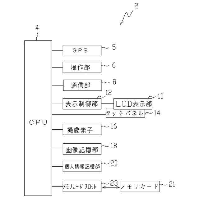 以下、図面を参照して第1の実施の形態に係るデジタルカメラについて説明する。図1は、実施の形態に係るデジタルカメラの構成を示すブロック図である。デジタルカメラ2は、デジタルカメラ2の各部を統括的に制御するCPU4を備えている。CPU4には、操作部6、GPS衛星から受信した信号に基づいて現在位置を測位するGPS5、アップロードする画像の画像データをインターネットを介してwebサーバに送信する通信部8、スルー画像等を表示するLCD表示部10の表示制御を行う表示制御部12、LCD表示部10において指等の接触の位置を検出するタッチパネル14、被写体光を撮像して撮像信号を生成する撮像素子16、撮像素子16により撮像された画像の画像データを一時的に記憶する画像記憶部18、点または線によって描かれた図形パターンを個人認証データとして記憶する個人情報記憶部20、及び画像データを記憶するメモリカード21を装着するメモリカードスロット23が接続されている。