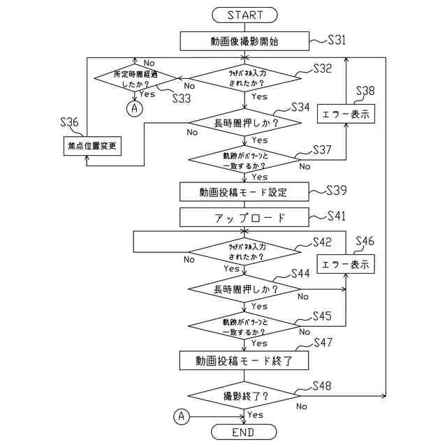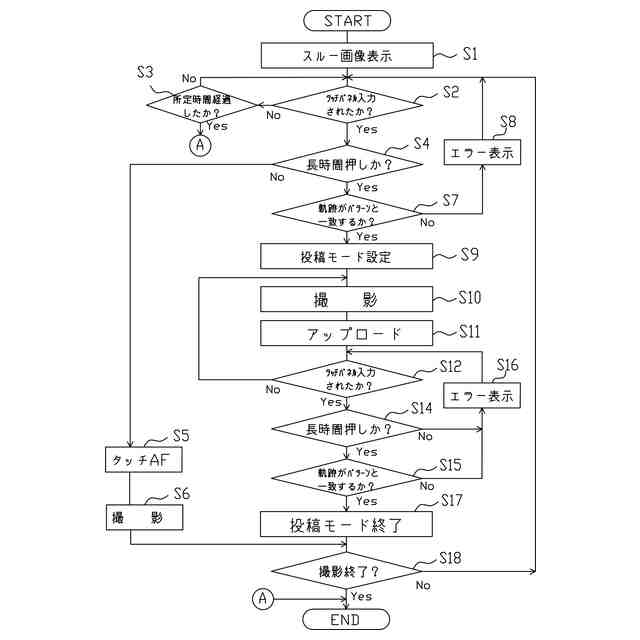 ここで、操作部6には、電源スイッチ(図示せず)、シャッタボタン(図示せず)等が含まれている。また、図形パターンには、後述する投稿モードの設定の可否を判定する際に用いられる第1図形パターン、及び投稿モードの終了の可否判定する際に用いられる第2図形パターンが存在する。なお、図形パターンは、予め操作者がLCD表示部10に所定の図形を指で描くことにより、個人情報記憶部20に登録したものである。