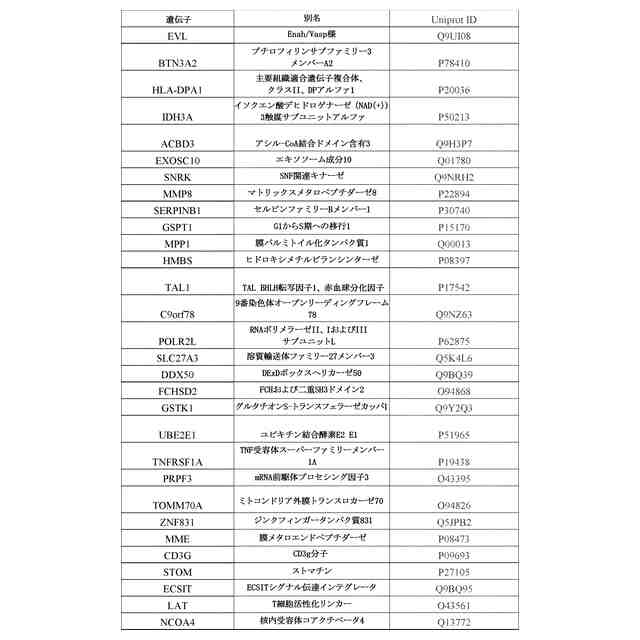 バイオマーカー1が、EVL、BTN3A2、HLA-DPA1、IDH3A、ACBD3、EXOSC10、SNRKまたはMMP8のうちの1つであり、
