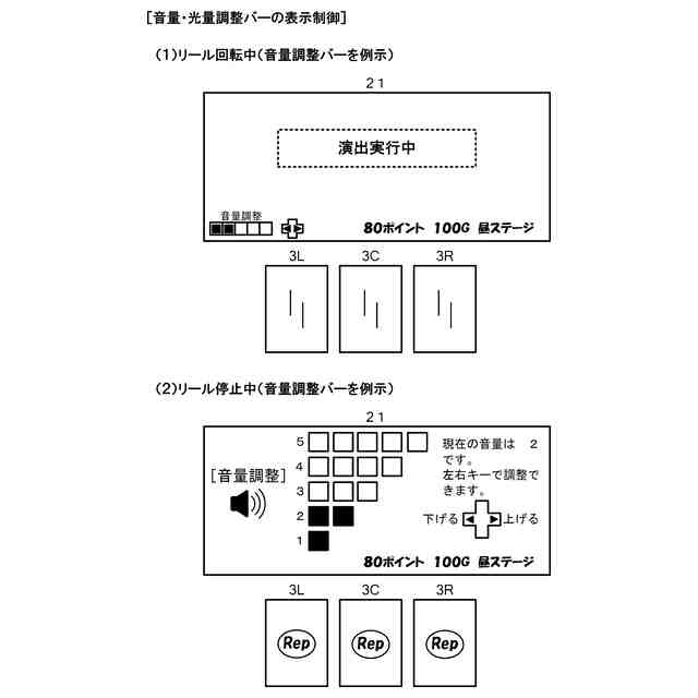 【解決手段】表示手段は、音量調整状態(例えば、図481に示す音量調整バーが表示された状態)で、音量調整に関する調整関連画像(例えば、図481(1)(2)に示す音量調整バー)を表示可能であり、第1の状況(例えば、図481(1)に示す状況)で音量調整状態となった場合には、第1態様(例えば、図481(1)に示す態様)で調整関連画像を表示可能であり、第2の状況(例えば、図481(2)に示す状況)で音量調整状態となった場合には、第2態様(例えば、図481(2)に示す態様)で調整関連画像を表示可能である。