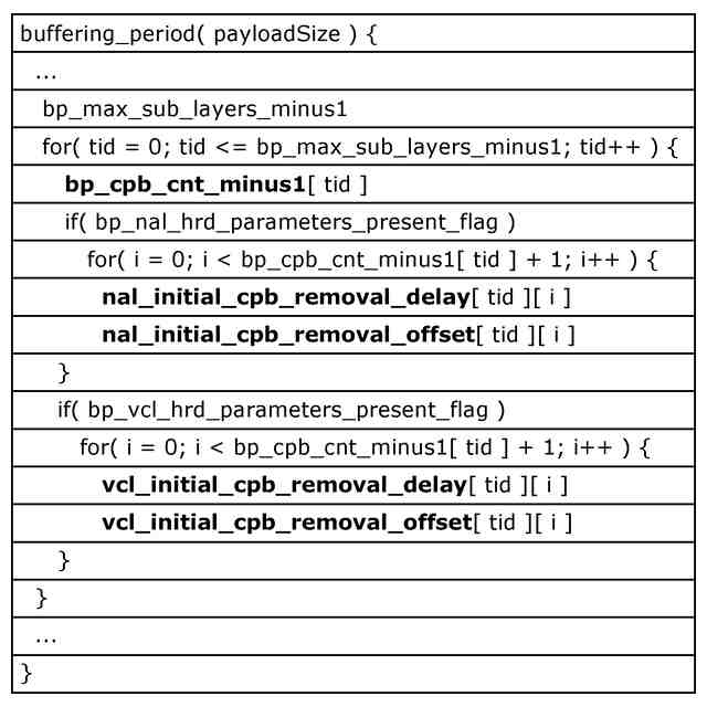 【解決手段】符号化装置(100)は、回路(a1)と、回路(a1)に接続されたメモリ(a2)とを備え、回路(a1)は、動作において、テンポラルサブレイヤーの数を示す第1情報をバッファリングピリオドSEIメッセージに格納し、バッファリングピリオドSEIメッセージとピクチャタイミングSEIメッセージとを含むビットストリームを生成し、バッファリングピリオドSEIメッセージは第1情報が示す数分繰り返される第1ループ構造を含み、それぞれの第1ループはCPBからデータを引き抜くタイミングの初期遅延を含み、ピクチャタイミングSEIメッセージは第1情報が示す数分繰り返される第2ループ構造を含み、それぞれの第2ループはCPBからデータを引き抜くタイミングに関するパラメータを含む。