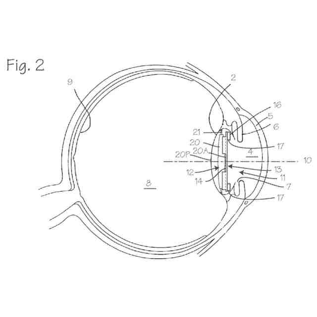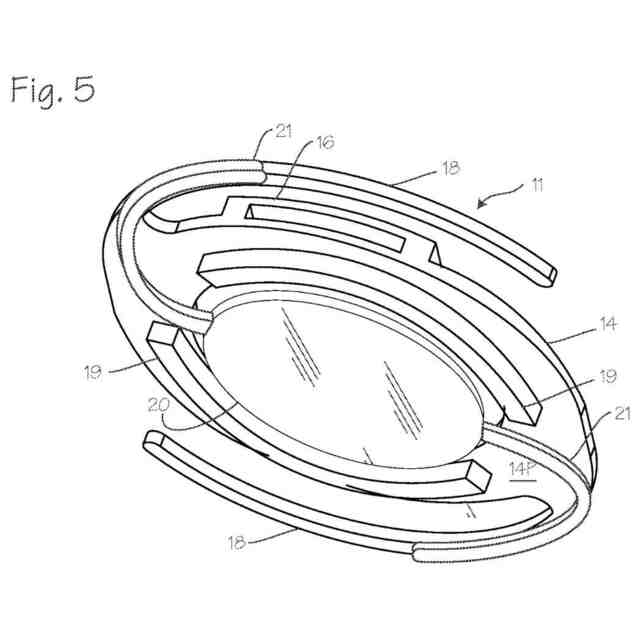 図2は、眼内での薬物送達プラットフォーム11の配置を眼内レンズ組立体12と共に示す。この例では、薬物送達プラットフォーム11は、リングの形態で提供され、眼内レンズ組立体12と共に水晶体嚢内に埋め込まれる。図2に示すように、薬物送達プラットフォームは、単独で設置することもできるが、眼内レンズ組立体12と共に使用することが意図されている。図2に示すように、薬物送達プラットフォームは、眼内レンズ組立体12の前方(眼内レンズ組立体12の前)に配置され、(眼の解剖学的構造に関して)後方(後ろ)に延びる保持リム又はスカートを有して、眼内レンズ上に取り付けられる。薬物送達プラットフォームは、虹彩の下方であって水晶体嚢の上方となる位置に配置することもできる。水晶体嚢は、天然レンズ又は人工レンズを含んでもよいし、レンズを全く含まなくてもよい。