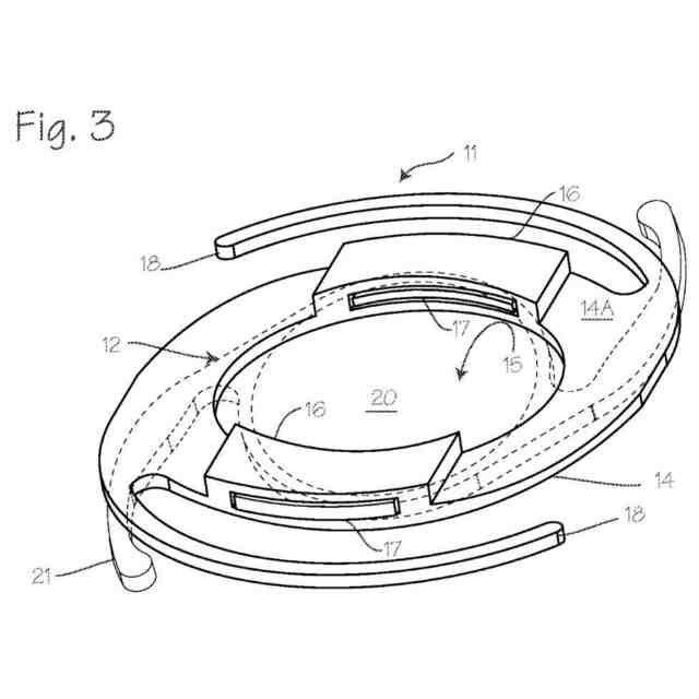 図3は、眼内レンズ組立体と共に使用するように構成された図2の薬物送達プラットフォームの前面図である。薬物送達プラットフォームはリング14を含み、このリング14は、好ましくはワッシャーのように平らであり、好ましくは隙間のない完全なリングであり、リングの360°全周に沿って連続し、前面14A及び後面14P(図4に示される)と中央にある開口部15とを有する。前面において、薬物送達プラットフォームは、薬物溶出塊17を保持するように構成された1以上の隔室16を含む。隔室は1つだけ設けて、それ以上の隔室を設けなくてもよいが、リングの周囲に配置された2以上の隔室を設けることが好ましい。薬物溶出塊は、ブロック、板、ウエハ、円筒状又は球状のペレットの形態で提供されてもよく、塊を収容する形状の内部空間を有する隔室内に確実に嵌合するように構成されてもよい。