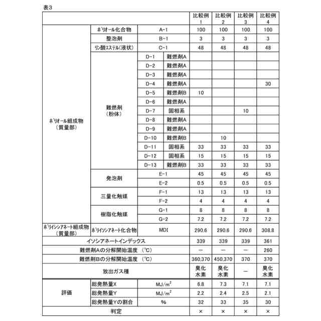 【解決手段】ポリオール化合物、ポリイソシアネート化合物、難燃剤、発泡剤、及び触媒を含有するウレタン樹脂組成物であって、前記ウレタン樹脂組成物からなるポリウレタンフォームを、ISO-5660の試験方法に準拠して、コーンカロリーメーター試験をしたときの0~1200秒までの総発熱量Xが8MJ/m