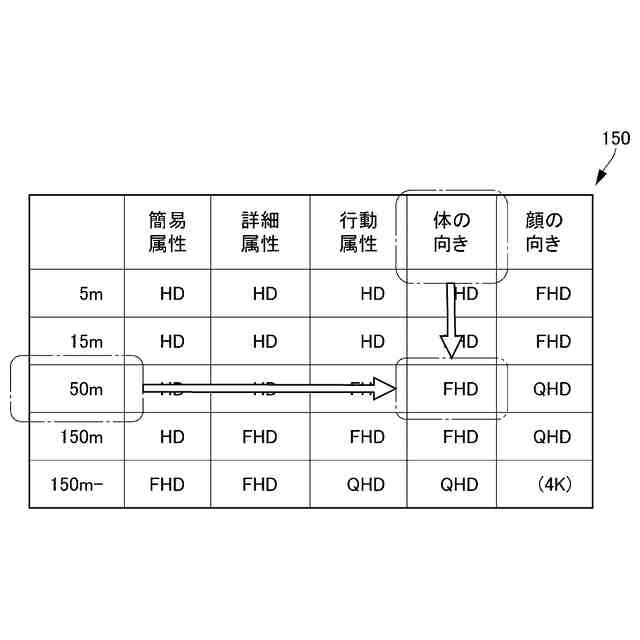 前記画像の解像度と前記距離との組み合わせにより判定可能な属性を決定するための、あらかじめ準備された検出属性出力テーブルを記憶する検出属性出力テーブル記憶部と、