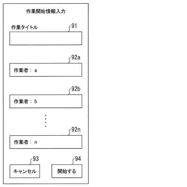 特定の作業者甲又は乙が図5に示す作業情報の選択画面で特定の作業情報(工事点検作業)を選択した後の携帯端末50A又は50Bの表示部53に表示される作業開始情報入力画面の一例を示す図である。