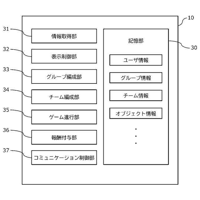 ゲームにおいて共同プレイを行うユーザを、前記グループに所属する複数のユーザの中から募集してチームを編成するチーム編成部と、