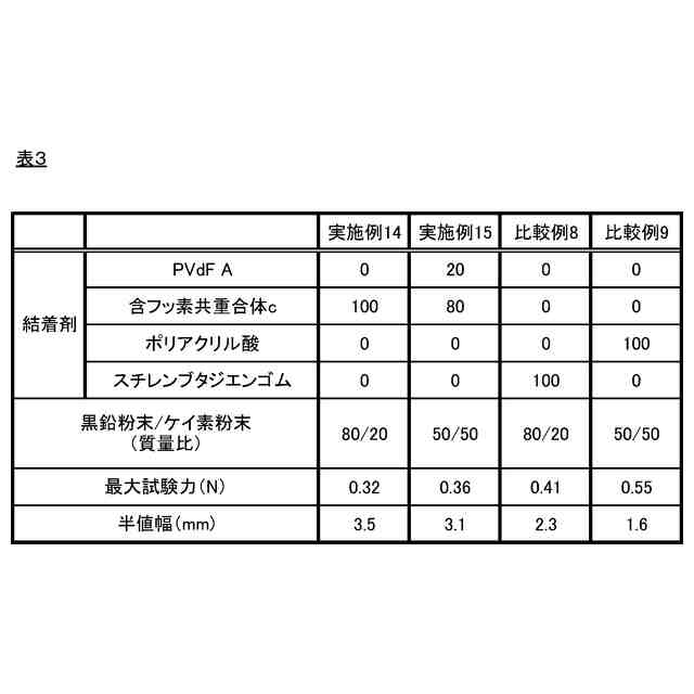 捲回型非水電解質電池は、正極と負極との間にセパレータを挟み、これらを捲回することにより製造される。捲回する際には、電極の電極材料層にも曲げ応力がかかるため、電極材料層を形成するために用いられる結着剤には、柔軟性に優れ、曲げ応力に耐え得る電極材料層を与えることができる性質が求められる。そこで、十分な柔軟性を示す電極材料層を形成できる結着剤として、特許文献3では、特定の構造を有する繰り返し単位(a)および特定の構造を有する繰り返し単位(b)を、極めて限定されたモル比で含有する含フッ素共重合体を含有する結着剤が提案されている。
