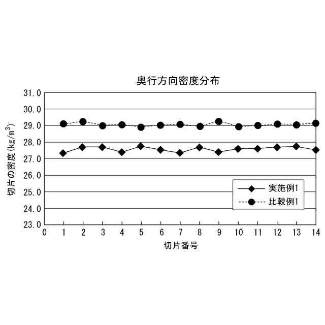 本発明者らがさらに検討したところ、集合体の強度のばらつきは、小片に加工する前のフェノール樹脂発泡体の幅方向の強度と奥行方向の強度のばらつきに起因することがわかった。小片に加工前のフェノール樹脂発泡体の幅方向の強度と奥行方向の強度にばらつきが存在すると、そのフェノール樹脂発泡体を小片に加工した際に、小片にも強度のばらつきが生じる。そのため、ある範囲の小片の集合体と、別の範囲の小片の集合体でも強度にばらつきが生じるものと推測される。