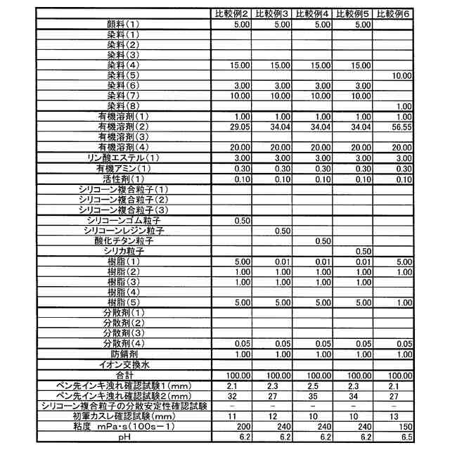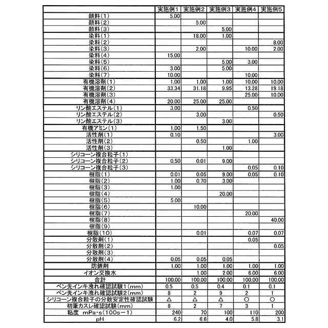 本発明に使用するボールペン用油性インキにおいて、該シリコーン複合粒子の具体例としては、KMP-600(平均粒子径5μm、ゴム硬度30デュロメータA、真比重0.99g/cm3)、同601(平均粒子径12μm、ゴム硬度30デュロメータA、真比重0.98g/cm3)、同602(平均粒子径30μm、ゴム硬度30デュロメータA、真比重0.98g/cm3)、同605(平均粒子径2μm、ゴム硬度75デュロメータA、真比重0.99g/cm3)、X-52-7030(平均粒子径0.8μm、ゴム硬度75デュロメータA、真比重1.01g/cm3)(以上、信越化学工業(株)製)が挙げられる。