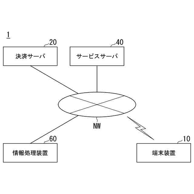 図1は、システム1の構成の一例を示す図である。システム1は、例えば、端末装置10と、決済サーバ20と、サービスサーバ40と、情報処理装置60とを備える。サービスサーバ40と、情報処理装置60とを組み合わせたものが「サービス提供システム」の一例であり、端末装置10で動作する後述する決済アプリケーションプログラムと、決済サーバ20と、情報処理装置60とを組み合わせたものが、「情報処理システム」の一例である。