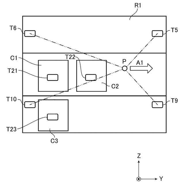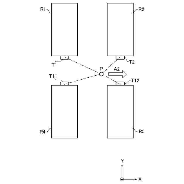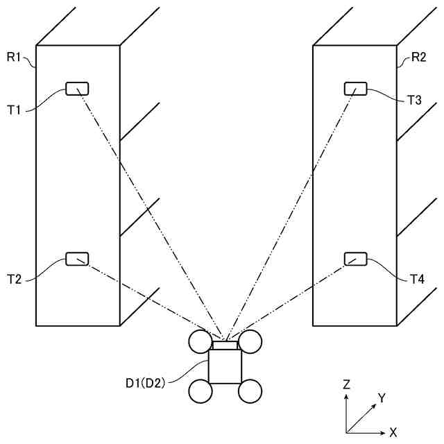 RFIDタグT1、T2、・・・、TNは、例えば、建物の内部において、互いに異なる位置に配置されている。具体的には、RFIDタグT1、T2、・・・、TNは、倉庫の内部に配置されている1つ又は複数の棚のそれぞれに保持されている。より具体的には、倉庫の内部に配置されている複数の棚のそれぞれに、1つ又は複数のRFIDタグが、互いに異なる位置に保持されている。例えば、図1に示すように、RFIDタグT1及びRFIDタグT2が、棚R1に保持されており、RFIDタグT3及びRFIDタグT4が、棚R2に保持されている。