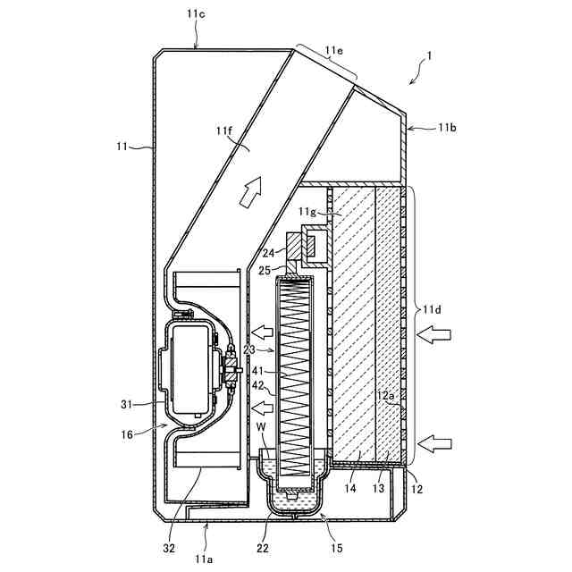 第1実施形態の加湿空気清浄機を模式的に図示する断面図である。