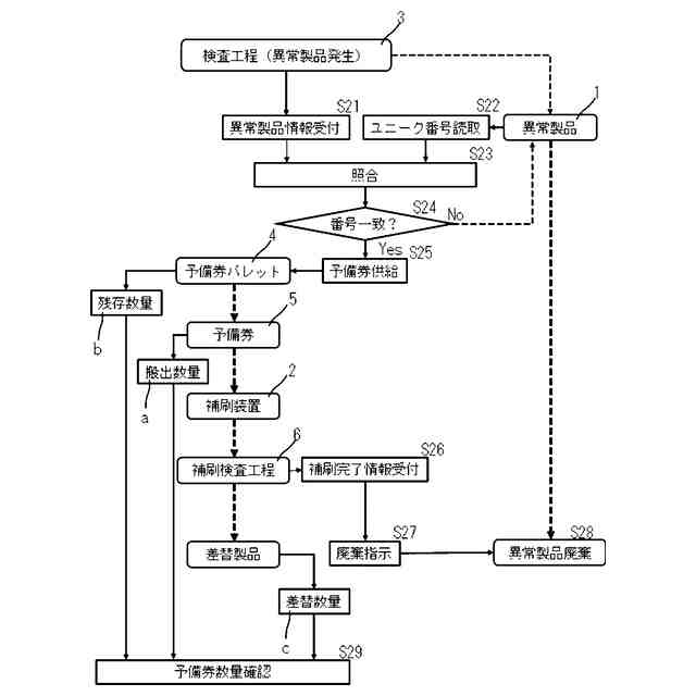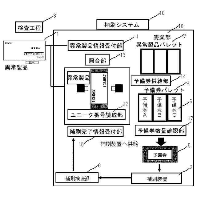 【解決手段】本発明の補刷システムは、発生した異常製品1についての券種情報とユニーク番号情報を受信する異常製品情報受付部11と、検査工程3から搬出された異常製品1に印刷されている券種とユニーク番号を読み取るユニーク番号読取部12と、券種情報と券種又はユニーク番号情報とユニーク番号の少なくとも一方を照合する照合部13と、照合部13で一致したことを判断すると、予備券パレット4から予備券5を選択し、選択した予備券5を補刷装置2に供給する予備券供給部14を備えたことを特徴とする。