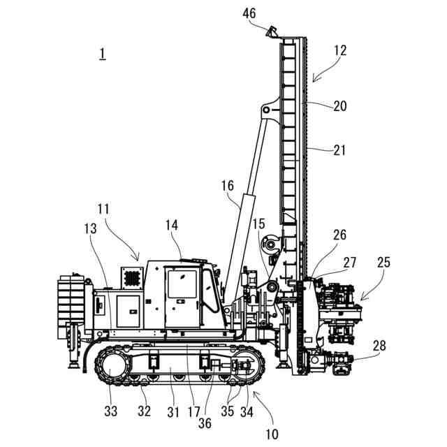 本実施形態に係る杭打機1について、図面を参照しながら説明する。図1は、本実施形態に係る杭打機1の側面図である。杭打機1は、地盤改良や建設に用いられる装置であり、下部走行体10と、この下部走行体10に旋回可能に設けられた上部旋回体11と、上部旋回体11の前部に立設されており、作業装置を昇降可能に保持するリーダ12と、を主に備えている。