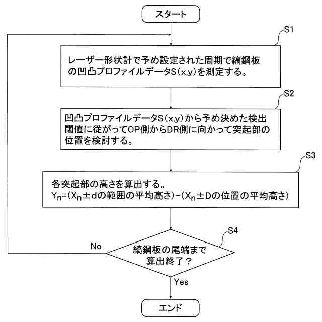 【解決手段】縞鋼板の複数の突起部を測定する縞鋼板の突起測定方法であって、ランアウトテーブルの出側であって、縞鋼板の両面のうち、少なくとも突起部が形成された縞鋼板の一方の面側に設置された突起測定装置によって縞鋼板の凹凸プロファイルを前記縞鋼板の全幅に亘って測定する測定工程(ステップS1)と、凹凸プロファイルから突起部の位置、および、突起部の高さを算出する算出工程(ステップS2、ステップS3)と、を有する。