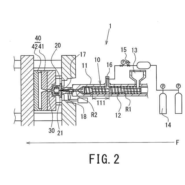 従来、樹脂成形の分野において、発泡射出成形は、樹脂量の削減、或いは、ソリ又はヒケ等の寸法精度向上を目的として広く用いられている。樹脂の発泡成形は、化学発泡法及び物理発泡法に大別される。これらの発泡法において、発泡剤は、主に窒素ガス・炭酸ガス・一酸化炭素、アンモニアガス、水蒸気等である。ただ、近年、環境負荷の軽減という観点から、二酸化炭素又は窒素等の不活性ガスを発泡剤として用いた物理発泡法により樹脂発泡する実例が増えている。例えば、特許第2625576号公報(特許文献1)が開示する高圧の超臨界流体を用いた成形法、又は、特許第6139038号公報(特許文献2)が開示する低圧ガスを用いた成形法等が実用化されている。