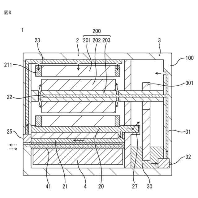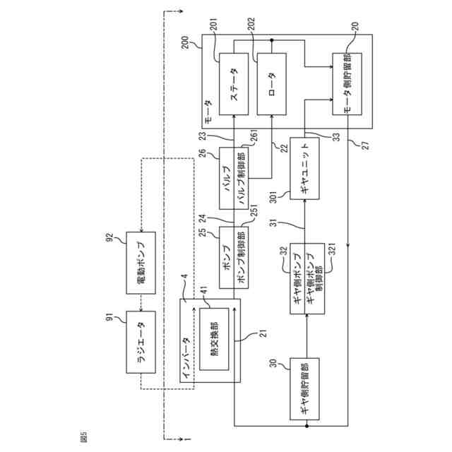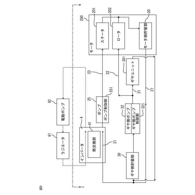 【解決手段】インバータ(4)は、外部で冷却された第1冷媒(40)を通流する熱交換部(41)を備え、モータ(200)は、第2冷媒(10)を貯えるモータ側貯留部(20)からの第2冷媒(10)を熱交換部(41)を介して冷却する熱交換通路(21)を有し、ギヤ側貯留部(30)の第2冷媒(10)をギヤユニット(301)に供給するギヤ側通路(31)を有し、熱交換通路(21)は、第2冷媒(10)を、コイル(211)側に供給するコイル側通路(23)、または、磁石(221)側に供給する磁石側通路(22)の内、どちらか1方、または、その両方と接続され、熱交換通路(21)の流路断面積(S1)は、コイル側通路(23)の流路断面積(S2)および磁石側通路(22)の流路断面積(S3)よりも大きい。