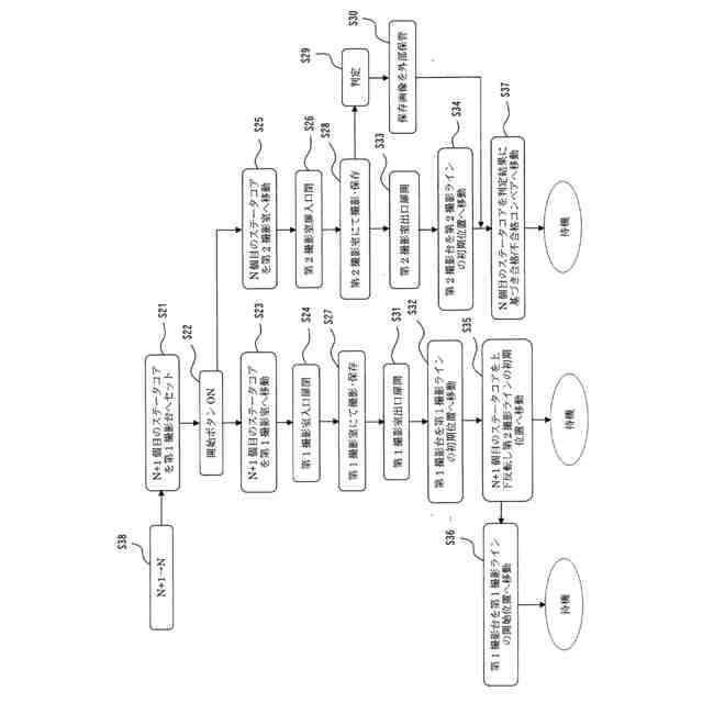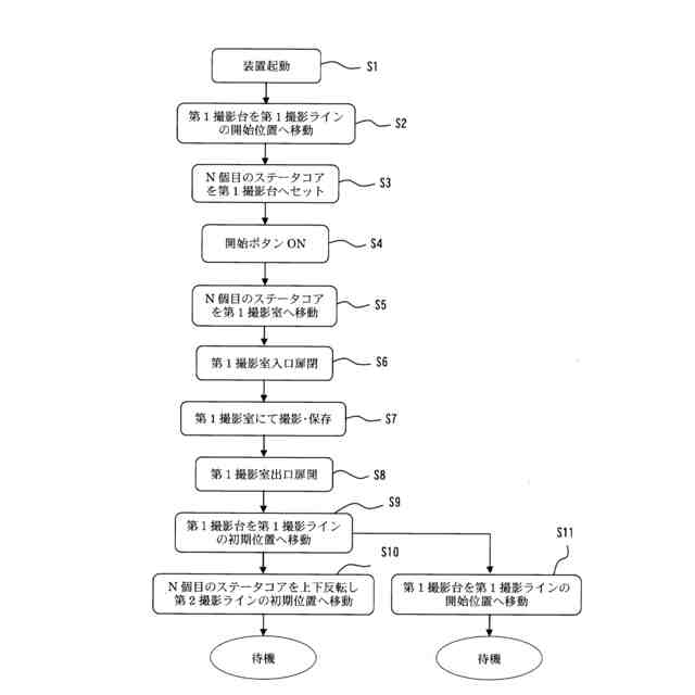 請求項3記載の発明は、外観検査対象物を挟持し、第1撮影ラインの第1撮影台から第2撮影ラインの第2撮影台へ上下位置を反転させて移動させるロボットアームを備えて構成したことに特徴を有する請求項1又は請求項2記載の外観検査装置。