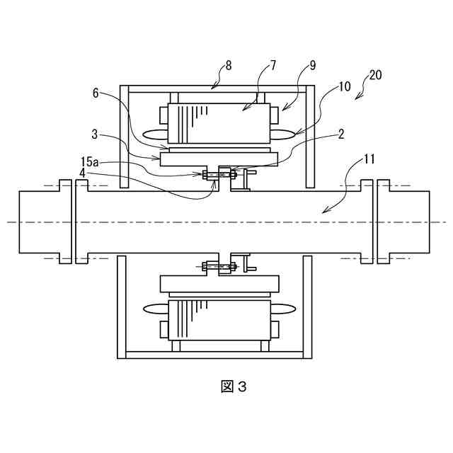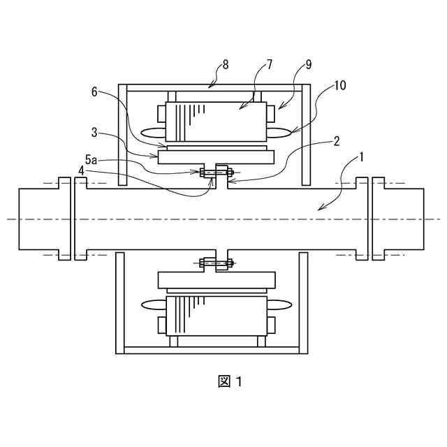 さらに固定子鉄心7には、軸方向に貫通する図示しないスロットが設けられていて、当該スロットに銅線からなる固定子巻き線10が収められている。軸発電機は、このような構造であり、固定子巻き線10と永久磁石6の電磁誘導により起電力を生じる仕組みとなっている。