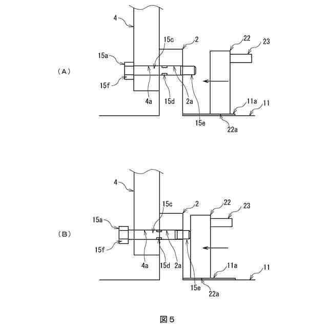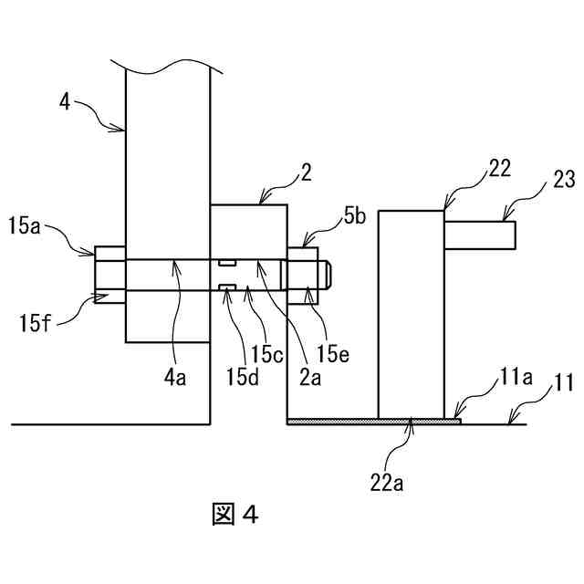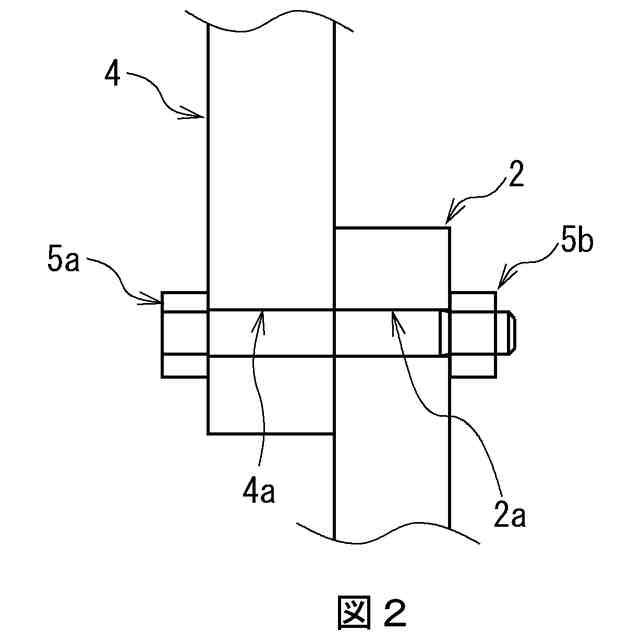 このような軸発電機では、不具合発生時、起電力が生じないように(つまり発電しないように)緊急で中間軸1と回転子鉄心3を切り離す必要があり、これを緊急切断と呼ぶ。を示す。緊急切断時には、中間軸フランジ2と回転子鉄心フランジ4との締結部の拡大図である図2に示すように、リーマボルト5aからナット5bを取り外し、中間軸フランジ2のボルト穴2aと回転子鉄心フランジ4のボルト穴4aからリーマボルト5aを引き抜かなければならない。