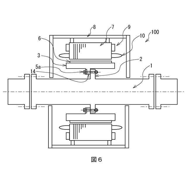 軸発電機は、主機関(エンジン)側の軸とプロペラ側の軸との間に設けられた円柱状の中間軸1を有している。この中間軸1は、円筒状の回転子鉄心3の内周側に配置されていて、中間軸1の外周から突出する中間軸フランジ2と、回転子鉄心3の内周から突出する回転子鉄心フランジ4とをリーマボルト5aとナット5b(図2)で締結することにより中間軸1に回転子鉄心3を固定するようになっている。また回転子鉄心3の外周には永久磁石6が取り付けられている。