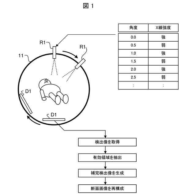放射線源R1は、撮影対象に向けてX線のコーンビームを放射する。検出器D1は、撮影対象を挟んで放射線源R1と対向し、撮影対象を透過した放射線の分布を検出像として検出する。