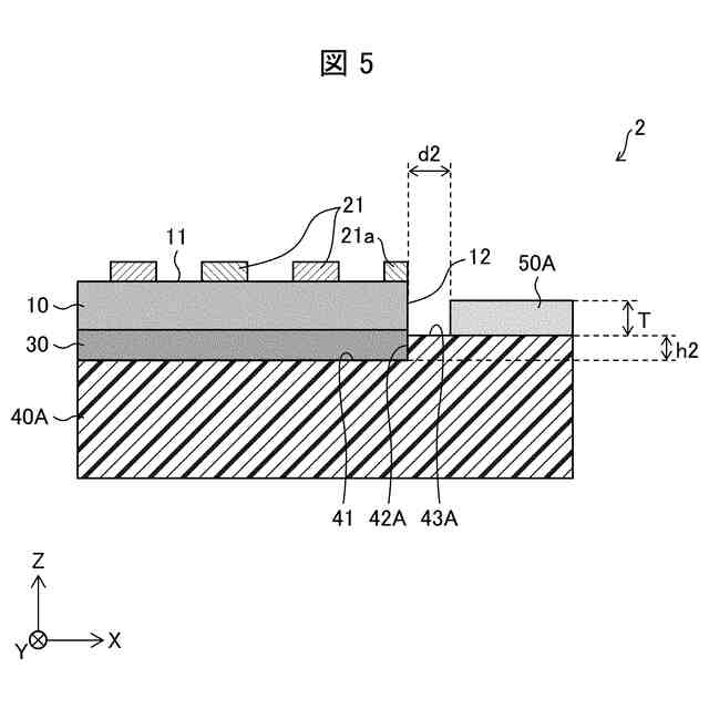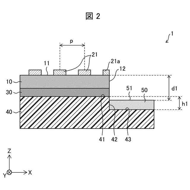 前記第1膜の厚さは、pの2倍以上であり、かつ、前記第1膜は、前記第1面に垂直な方向から見た平面視において、前記端面から離隔している、