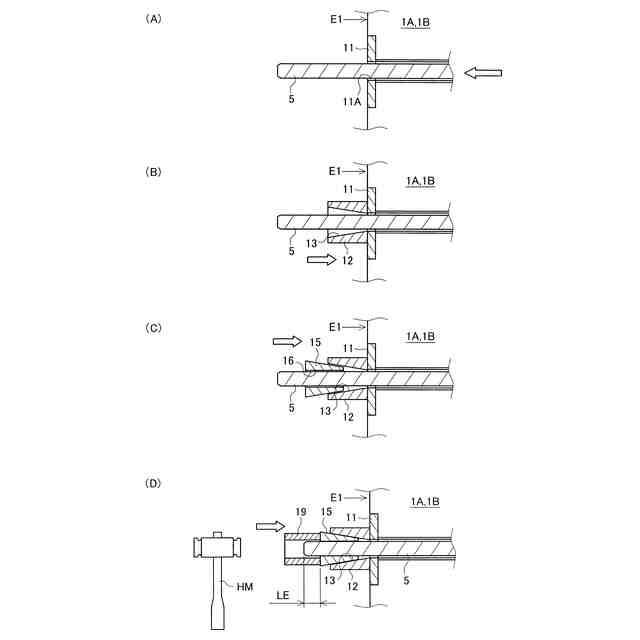 前記緊張材(5)の他端側に取り付けた緊張装置(6)を作動させて前記緊張材(5)に緊張力を導入することにより、前記雄部材(15)を前記第1貫通孔(13)に嵌入する緊張力導入工程と、を含む