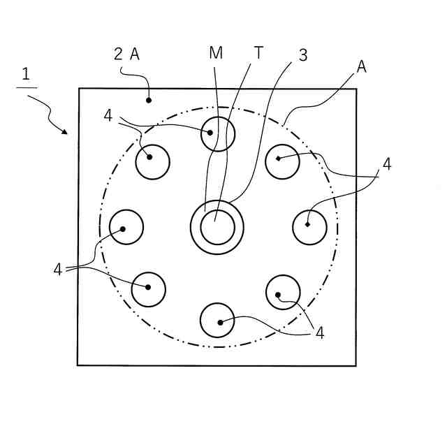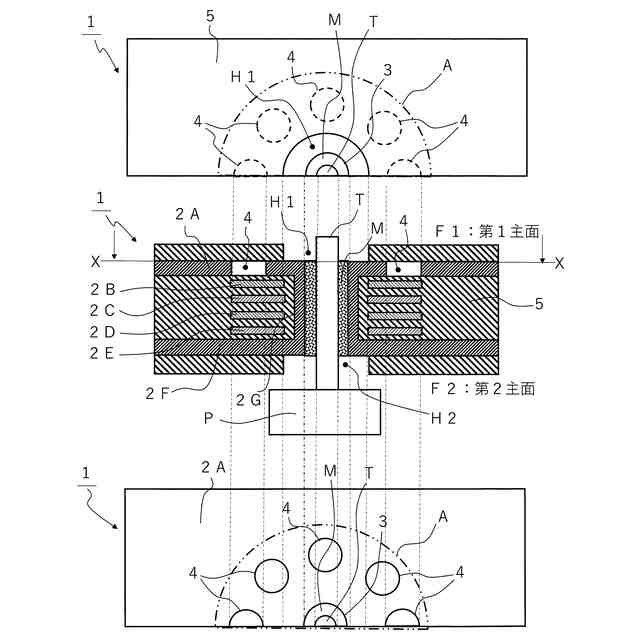 図1に示す電子基板1は、複数の導体層2A~2Fを厚さ方向(中段で上下方向)に配置した構造を有する多層型の基板であり、図1の中段に示すように、表裏関係にある第1主面(上面)F1及び第2主面(下面)F2を有する。導体層2A~2Fは、代表的には銅製であり、特に、銅の仕上がり厚さが140μm以上の基板は厚銅導体層と呼ばれる。