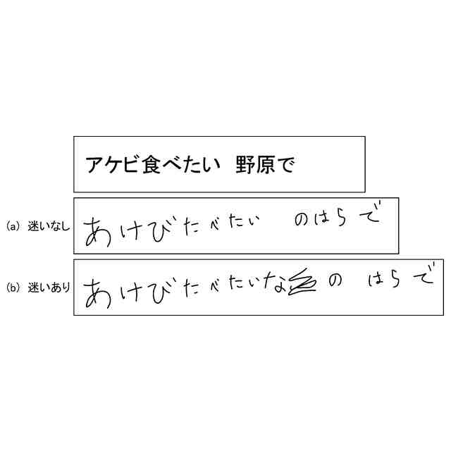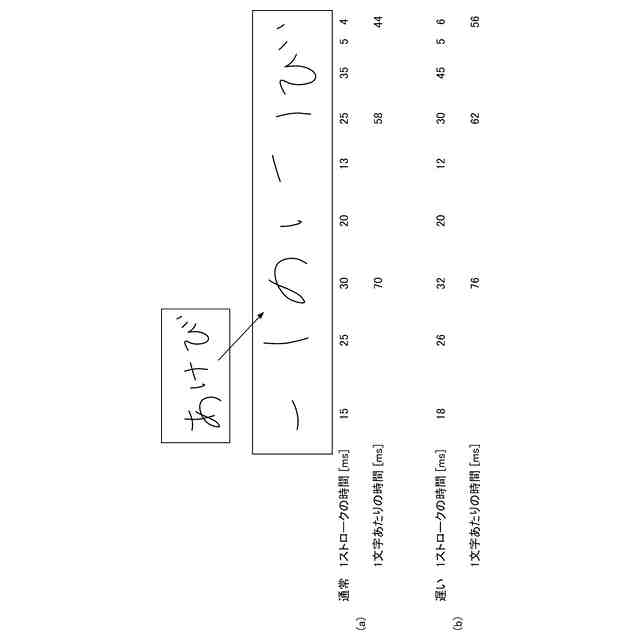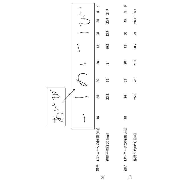 手書き入力装置においては、ユーザが手書き入力する内容によっては、ユーザによる手書き入力の動作が変化する場合がある。例えば、ユーザが手書きしたい単語を思い出しながら手書き入力する際には、手書き入力の動作がゆっくりとなる場合がある。また、ユーザが文章を手書き入力するときに人名や固有名詞などの単語が思い出せない際には、文章内に空白部分を作りながら手書き入力する場合がある。