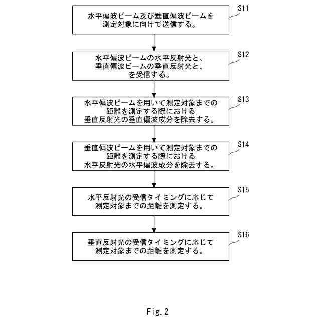 本開示に係るプログラムは、水平偏波ビーム及び垂直偏波ビームを測定対象に向けて送信し、前記測定対象において反射した前記水平偏波ビームの水平反射光と、前記測定対象において反射した前記垂直偏波ビームの垂直反射光とを受信し、前記水平偏波ビームを用いて前記測定対象までの第1の距離を測定する際における前記垂直反射光の垂直偏波成分を除去し、前記垂直偏波ビームを用いて前記測定対象までの第2の距離を測定する際における前記水平反射光の水平偏波成分を除去し、前記水平反射光の受信タイミングに応じて前記測定対象までの第1の距離を測定し、前記垂直反射光の受信タイミングに応じて前記測定対象までの第2の距離を測定することをコンピュータに実行させる。