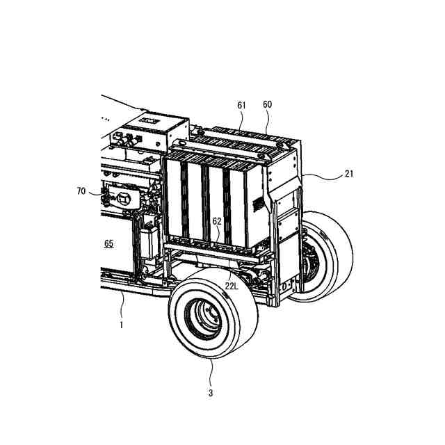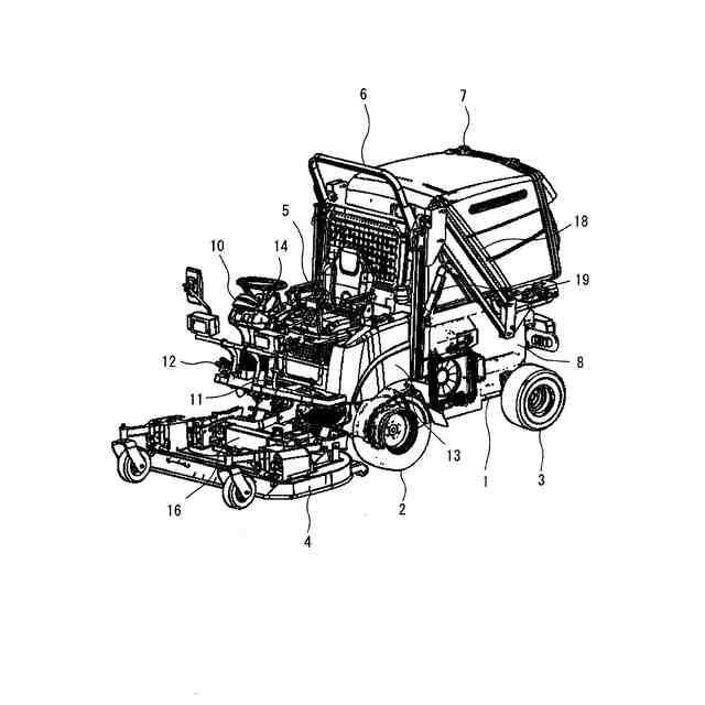 【解決手段】集草容器(7)の下側に、作業装置(4)を駆動する第1電動機(30)と、前輪(2)を駆動する第2電動機(40)を設け、第1電動機(30)と第2電動機(40)の前側に、第1電動機(30)と第2電動機(40)の出力回転を増減速するギヤケース(50)を設け、作業装置(4)が連結されるギヤケース(50)の第1出力軸(31)よりも伝動経路の上流側に第2出力軸(33)を設け、第2出力軸(33)に油圧ポンプ(51)を連結した。