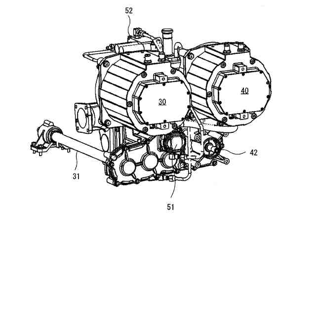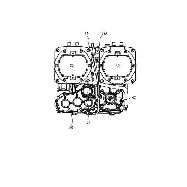 請求項5記載の発明は、前記ギヤケース(50)の上部に、前記クラッチ(55)を制動するバルブ(52)を設け、前記油圧ポンプ(51)とバルブ(52)を配管(53A)で接続し、該配管(53A)を、前記第1電動機(30)と第2電動機(40)の間に配策した請求項4記載の作業車両である。