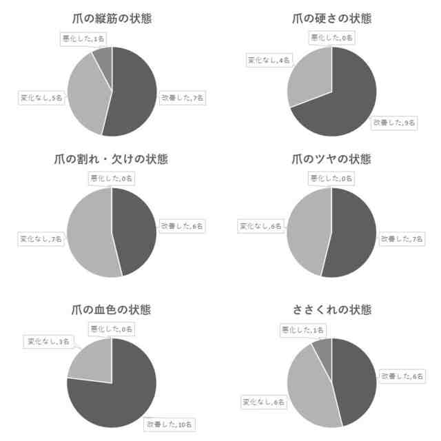 摂取4週間後の、爪の状態に関するアンケート結果を項目ごとにまとめたグラフである。