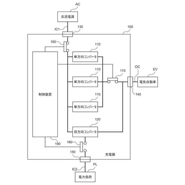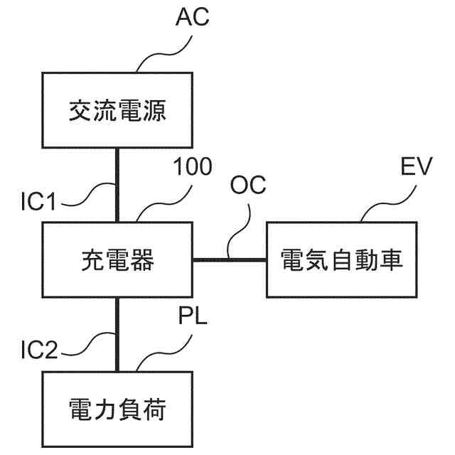 充電器100は、充電ケーブルOCを用いて電気自動車EVに接続される。充電器100は、第1電源ケーブルIC1を用いて交流電源ACに接続される。充電器100は、第2電源ケーブルIC2を用いて電力負荷PLに接続される。充電器100は、交流電源ACから供給される交流電力を直流電力に変換して電気自動車EVに供給する。充電器100は、電気自動車EVから供給される直流電力を交流電力に変換して電力負荷PLに供給する。