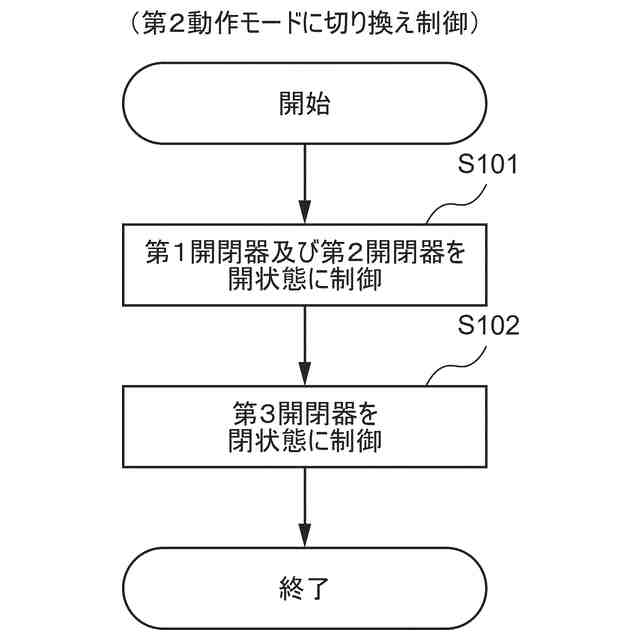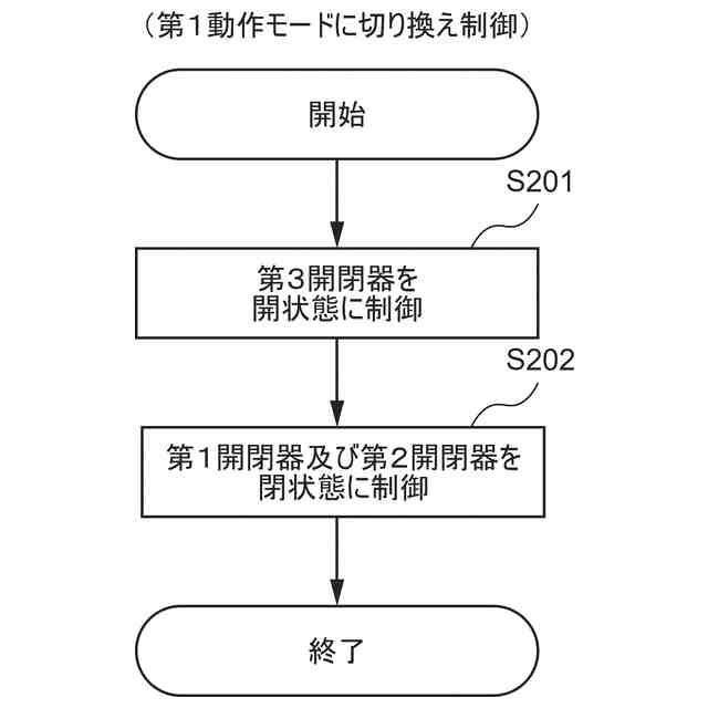 前記制御装置は、前記第1開閉器及び前記第2開閉器を閉状態から開状態に制御した後に、前記第3開閉器を開状態から閉状態に制御することにより、前記動作モードを前記第1動作モードから前記第2動作モードに切り換える、請求項8に記載の充電器。