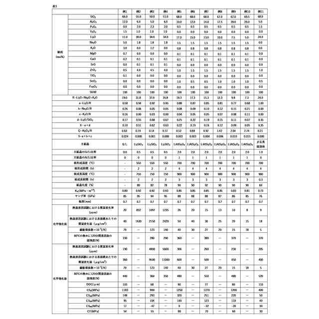 結晶化ガラスはその組成や製造方法により構造内部に析出される結晶の種類などの構成が異なり、該構成の違いによって落下強度特性や耐候特性が異なる。耐候特性が悪い結晶化ガラスは、環境負荷により表面状態が劣化し易く、これにより面強度が低下し易いという問題がある。