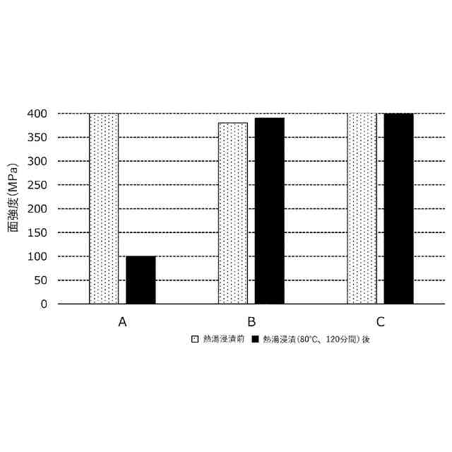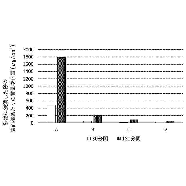 80℃の熱水に120分間浸漬した際の表面積あたりの質量変化量が、浸漬前と比較して、1500μg/cm